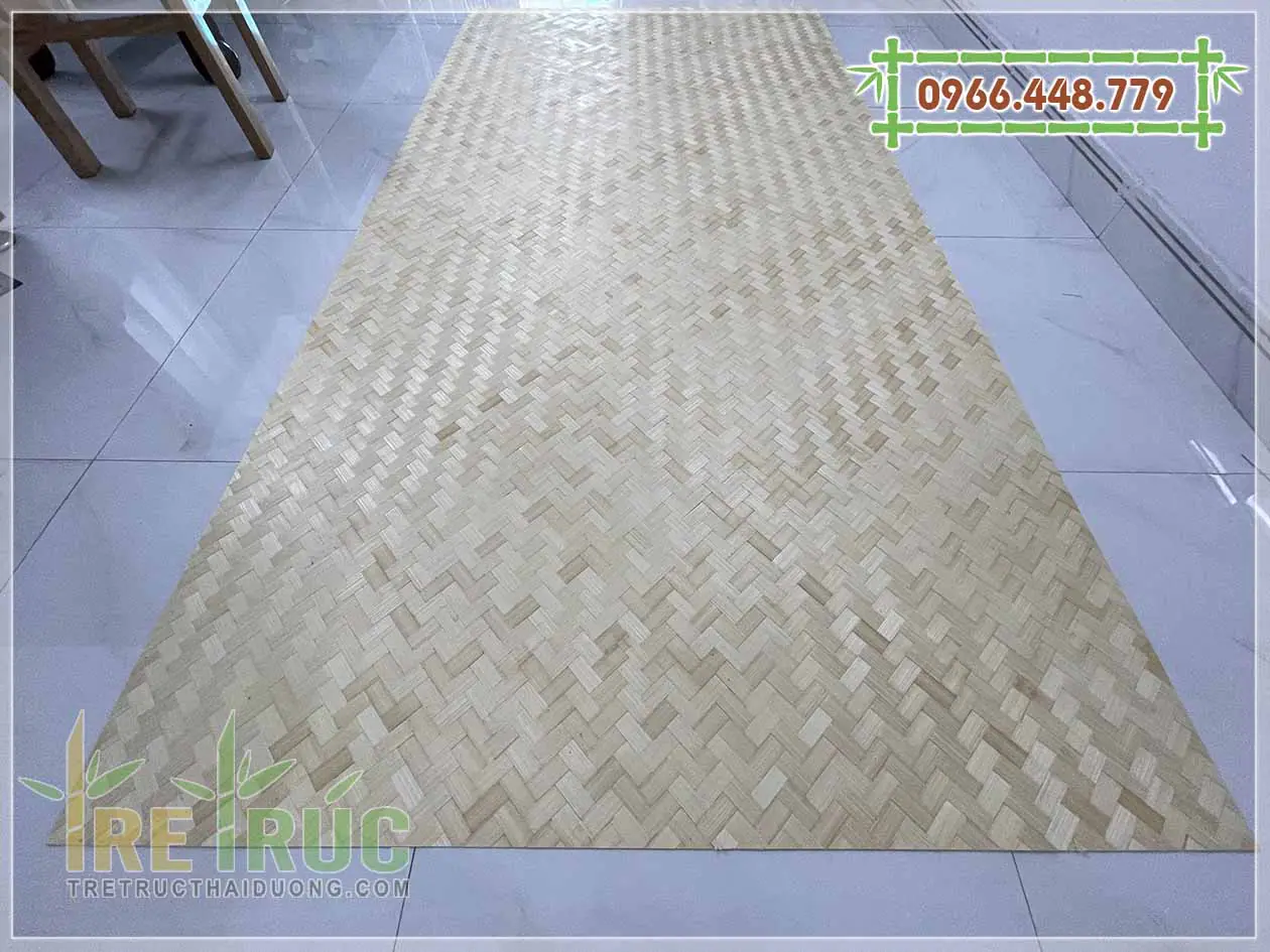 Tấm cót ép tre 1 lớp có độ dày từ 1.5mm-2mm, độ rộng nan khoảng 2.5cm, kích thước chuẩn dài x rộng: 2.44m x 1.22m.
